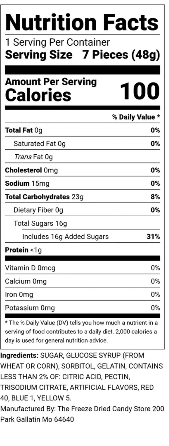 GET READY FOR A BURST OF FRUITY FUN WITH THESE FREEZE DRIED WONDERS! EACH BITE GIVES YOU THAT SATISFYING CRUNCH, WHILE THE FUTIY FLAVOR DANCES ON YOUR TASTE BUDS. SNACK HAPPY WITH A FLAVOR EXPLOSION IN EVERY BITE!