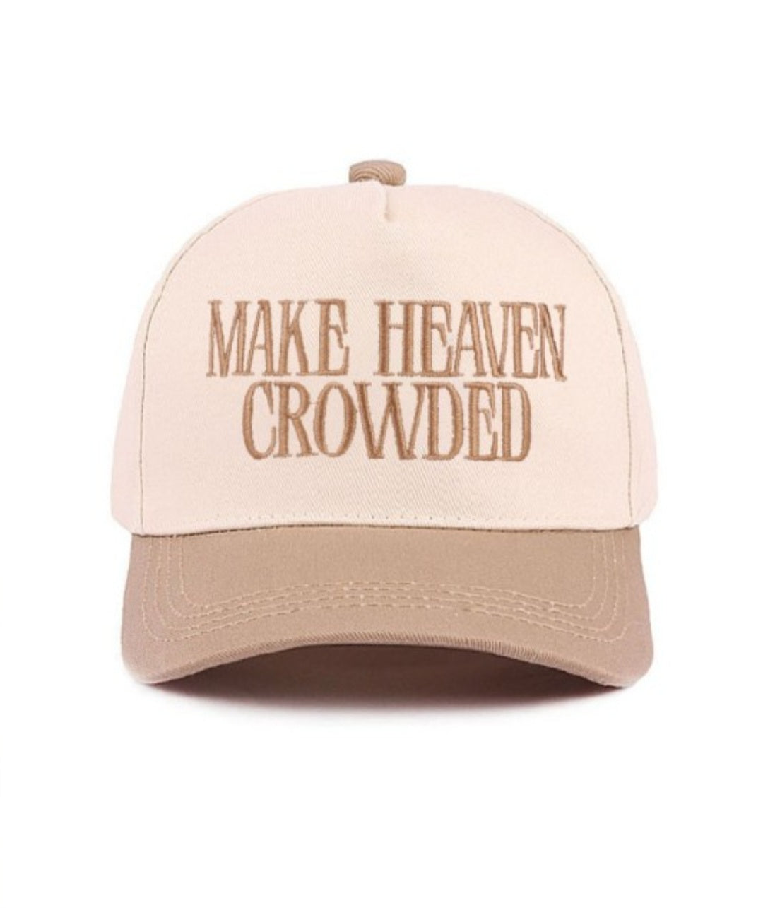 MAKE HEAVEN CROWDED TWO TONE HAT, ALL SEASONS, ADJUSTABLE STRAP WITH METAL BUCKLE, CIRCUMFERENCE 22-25", BRIM 2.35"