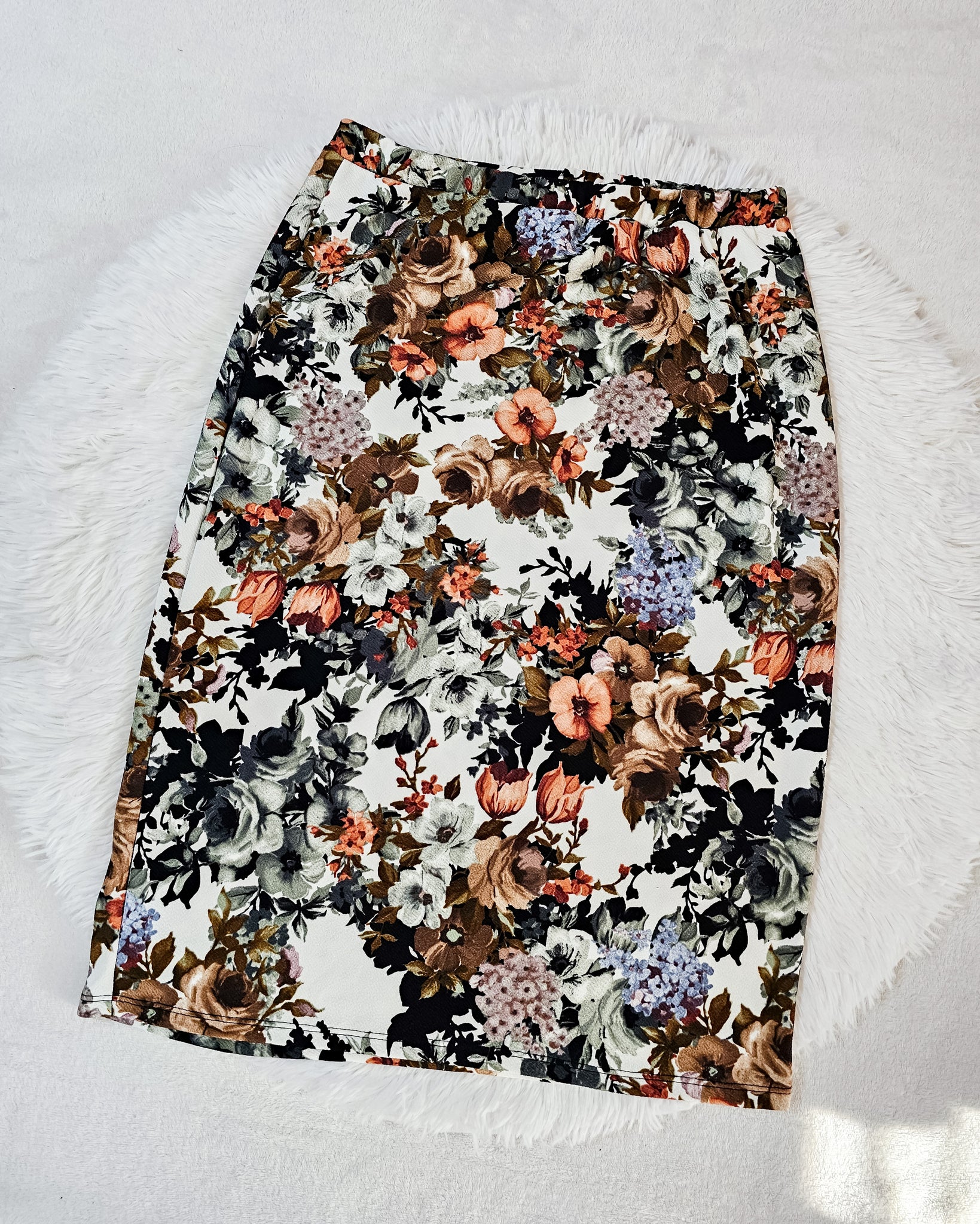 FLORAL MIDI PENCIL SKIRT, ELASTIC WAISTBAND, NO SLIT, 27" LENGTH