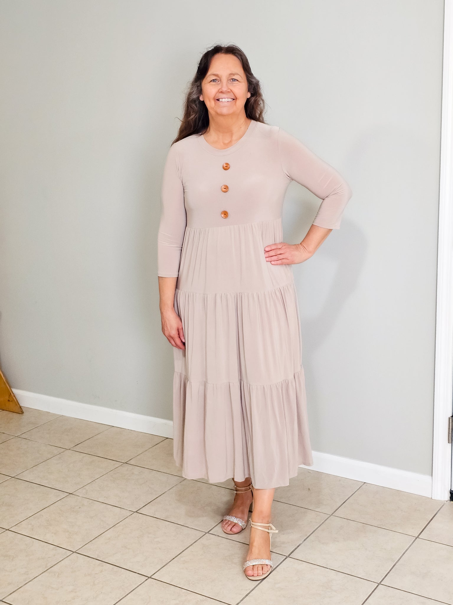 NETURAL TIERED MIDI DRESS, POCKETS, 3/4 SLEEVES, BUTTON DETAIL, STRETCHY