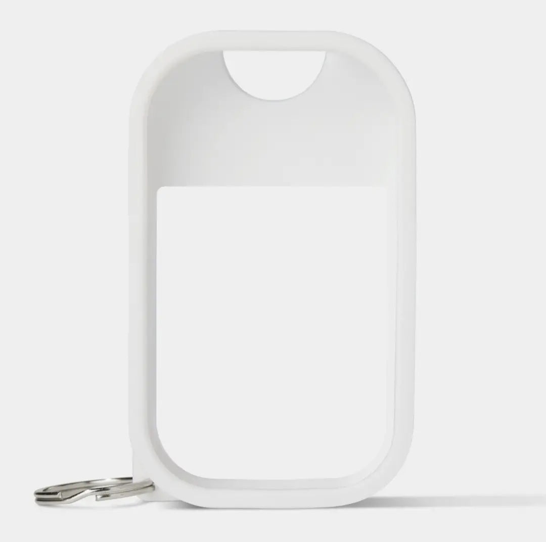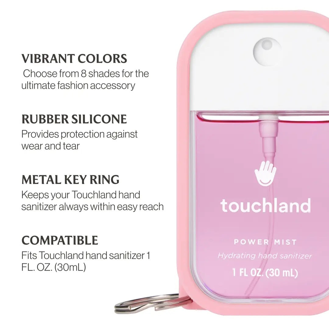 THE PERFECT ACCESSORY FOR YOUR TOUCHLAND HAND SANITIZER. RUBBER SILICONE, METAL KEY RING, COMPATIBLE WITH 1FL. OZ, HAND SANITIZER NOT INCLUDED